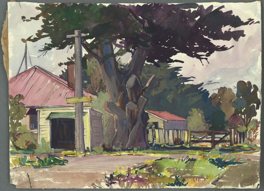 Painting of Brightwater Terrace, Palmerston North, showing house and bus shelter. Pen and wash. Colour. John Tetley was a parasitologist at Massey Agricultural College and a well known amateur artist who exhibited locally.