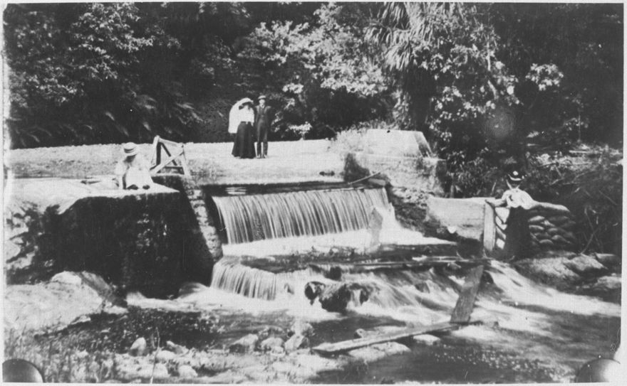 The original Turitea Dam was submerged after the second dam was raised to 50 ft in 1912. This new enlarged structured was officially opened February 17 1913 and remained in use until 1957 when a 100 ft high dam was constructed.