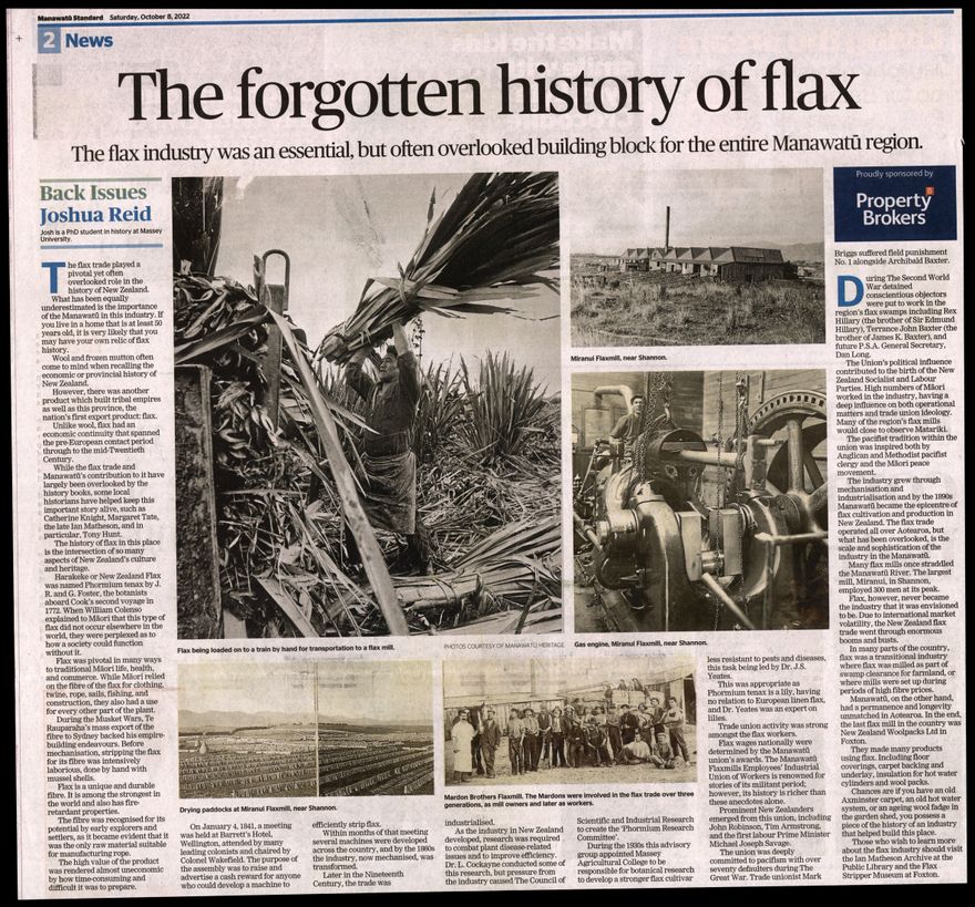 Local historians weekly "Back Issues" article in the Manawatū Standard. The role and history of flax in Manawatū and Horowhenua, from pre-European times to the mid- twentieth century. Harakeke, or New Zealand Flax, was named Phormium tenax by botonists aboard Captain Cook's voyage in 1772. Flax was pivotal to traditional Māori life., health and commerce. As European immigrants settled in Aotearoa, flax became mostly a transitional industry, milled as part of swamp clearance for farmland. In the Manawatū and Horowhenua, the industry was more permanent. The last flax mill in the country was New Zealand Woolpack and Textiles Ltd, Foxton. It closed in 1973.