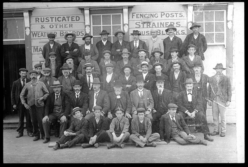 Employees of Palmerston North Sash and Door Co. Ltd., Albert Street, Palmerston North, about 1902. Back row: Fourth from the left - Archie Martin (woodcarver)