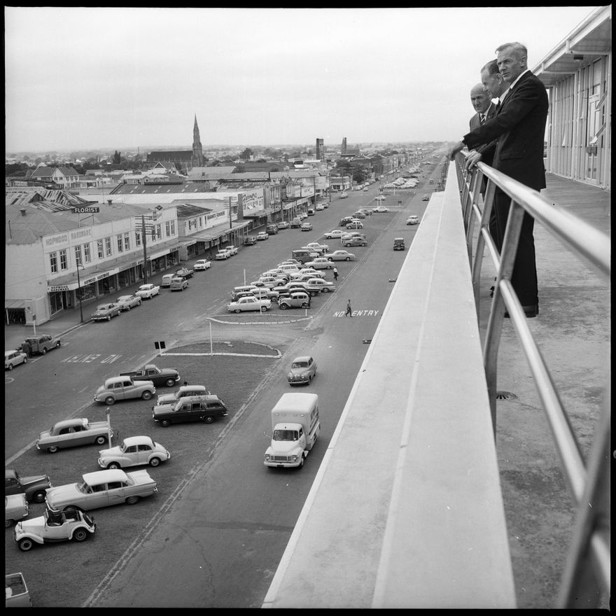 This image was taken for a story that ran in The Manawatu Evening Standard on 27th January 1966 "The noted British traffic authority, Professor C. Buchanan, arrived in Palmerston North today to spend five hours in the city. Professor Buchanan, who holds the chair of transport at the Imperial College of Science and Technology at London, is having informal discussions with the City Council concerning aspects of the city's master transport plan. The photograph shows Professor Buchanan (centre) with Cr. D.T. Spring (left) and the town clerk (Mr. A.M.P. Hall) on the balcony of the new library."