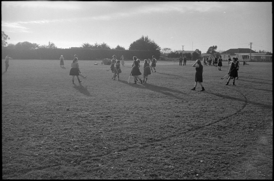 Caption: “Hockey at Wereroa Reserve, Levin. The game shown here is between Rovers and College A as the College team presses for a goal.”