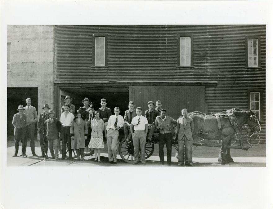 Manawatū Flour Mills staff photograph. Individuals identified by John Ireland, 10 June, 1968: L-R: Les Hemmingsen, L.A. Ferguson, Unknown, Frank Lunn, Unknown (at back), John Reece Cole (front), Jack Barker (with dog), Unknown (front), Miss Barber, Unknown, Horace Ruth, Jack Rogers (back), Len Thorn, Fisher (back), Unknown (back), Unknown (front), Jack Baubery.