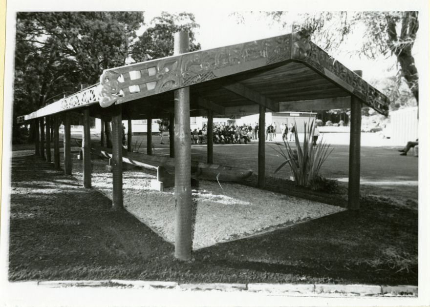 I hangaia ai te whakamaru waka ki te totara me te kahikatea. Nā te ope Tūtāngata o Te Papaiōea ngā whakairo. I puta te waka i te one o Santoft i te tau 1965. E noho ana te waka i te Ngahere o Santoft. A canoe shelter, made of totara and kahikatea, at the Santoft Forest Headquarters, houses the waka that was washed up on Santoft beach in 1965. The carvings were completed by the Palmerston North group Tūtāngata.