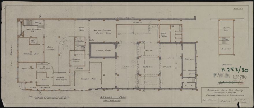 Alterations to be made to the then Municipal Chambers in the Square. It appears these plans did not go ahead but instead a new building at the front was constructed in 1945, joined to what remained of the building at the back.