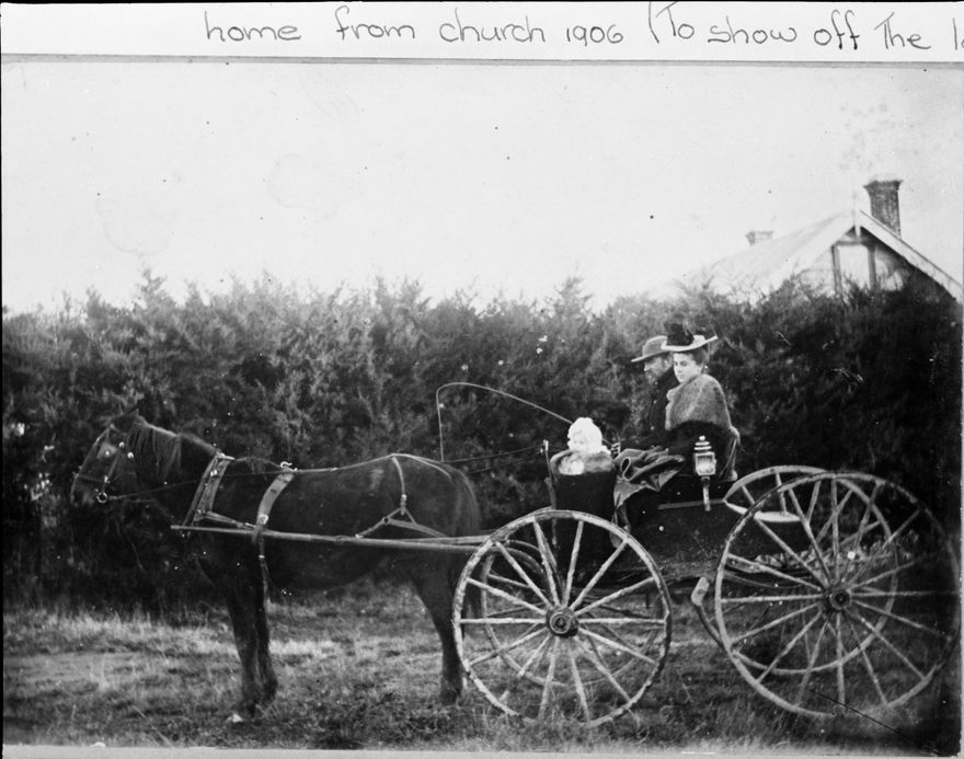 Mr & Mrs John Hobbs and daughter, Rosalyn, of Aorangi Road, Kairanga, on their way home from church.