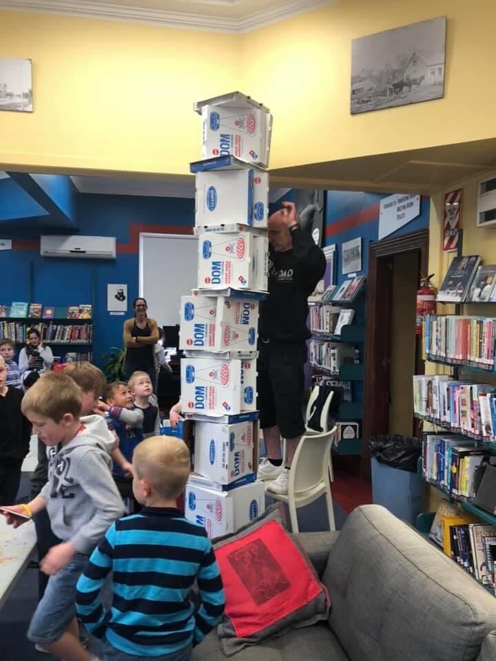 Proving empty pizza boxes can be educational by seeing how high the tower could get. Maths is Fun is a programme run during the school holidays and run by a registered teacher. Tim Jones was the teacher running it in 2019 for the Ashhurst Library.