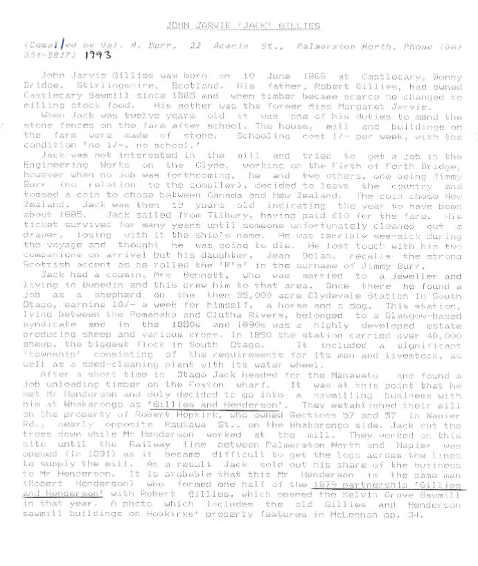 Article on John Gillies (1866 - 1940). In the 19th century he was involved in the sawmilling and dairy industries in the Manawatū, and later began a taxi service.