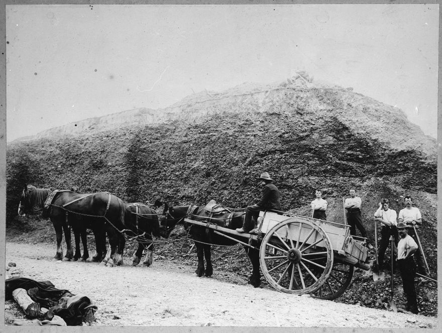 This photograph was taken at a metal pit on or adjacent to Mr Short's Estate on Pararorangi Road, near Waituna West. The metal from this pit was used to metal Parorangi Road and other roads from Kinsted County Council. The men in the photograph are, from left: Mr Tom Murray (from Awahuri, owner and driver of the team), Mr Charlie Pilcher (?), Mr Len Eggers (with elbow on shovel), Mr Fred Eggers (in foreground - father of Len Eggers), Mr Tom Mason (who had the contract for metalling the road). At the top of the photograph is another man, whose identity is unknown.