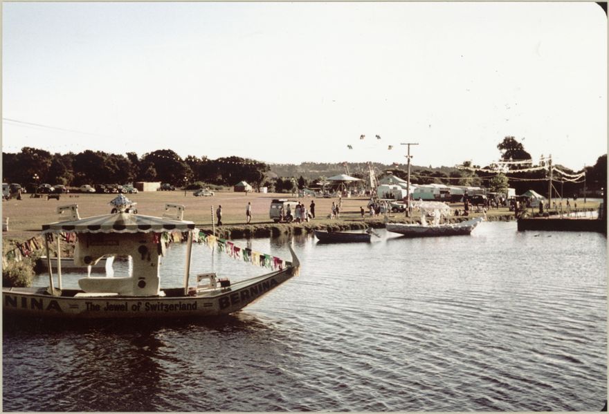 Commercially sponsored gondolas on Hokowhitu Lagoon during the “Carnival of the Lake’ festival. The Carnival of The Lake, centred around Hokowhitu Lagoon, was an annual event organised by the Public Relations Office for a few years in the early 1960s.