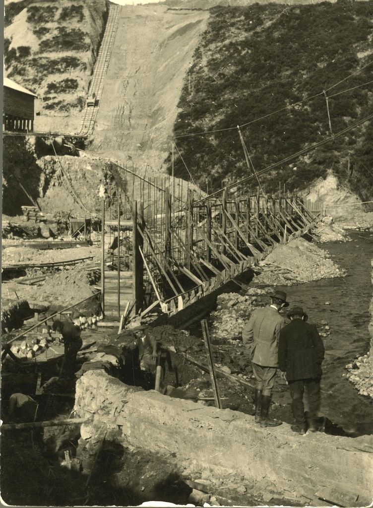 This view shows the foundations being laid for the power house and the Mangaore Stream diverted to its new channel alongside the power house site. In the left background a cut along the face of the ridge can be seen, marking the site of the future pipeline to the power house. The Mangahao Power Station provides hydroelectric power and is situated near the town of Shannon. It serves Wellington, Horowhenua, Taranaki, Hawkes Bay, and the Wairarapa. After being delayed by the first world war construction began in late 1919 and the station opened in November 1924.