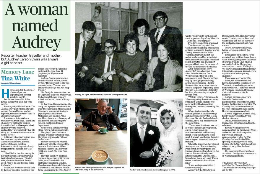 Journalist Tina White's weekly "Memory Lane" article in the Manawatū Standard. Article about the life of 1960's Manawatū Evening Standard reporter Audrey Ewan (nee Carson). Told by her husband, journalist John Ewan, author of the book "The Audrey Story".