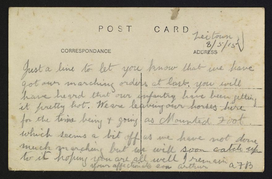 Postcard from Arthur Batchelar to his parents, while serving in World War One