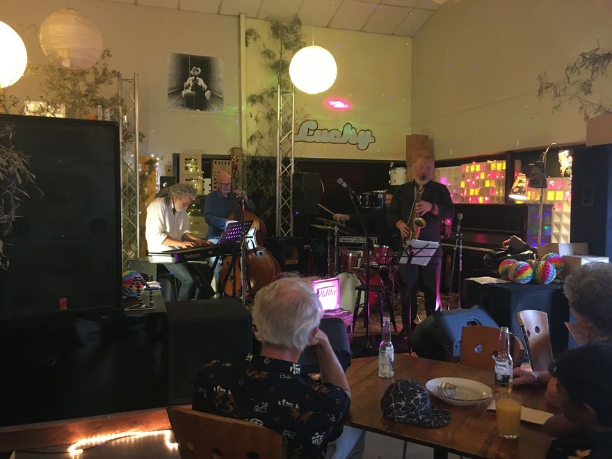 Unwind - (L-R) Norman Meehan (keyboard), Paul Dyne (bass), Julien Dyne (drums) and Hayden Chisholm (alto saxophone) - performing at Lucky Bar + Kitchen in Whanganui. This concert was part of the quartet's tour supporting of the release of "Saffron", their third album (and first with the addition of Julien Dyne).