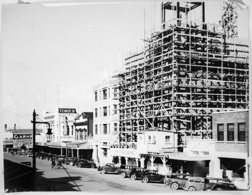 This photograph looks down Broadway Avenue from The Square. The building under construction is that of the Temperance and General Mutual Life Society Building, an insurance company that operated in Australia and New Zealand. In the 1920s and 1930s the Society engaged in a program of expanding its offices, and they constructed a number of new buildings with distinctive characteristics - multi-storey with a tower and signage with the society's name. From Right: T&G Building; AMP Building; Daisy's Coffee Bar; an unidentified hairdressers; Bennett's Bookshop; The Manawatu Daily Times office; Garners Department Store