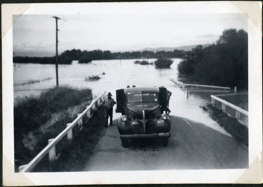 The 1953 flooding of the Manawatu and Oroua River was one of the worst on record for the area. This photograph shows a car on a flooded road near Bourke's Drain during the Rangiotu Flood. The photograph was taken from the Main Road looking towards Palmerston North.