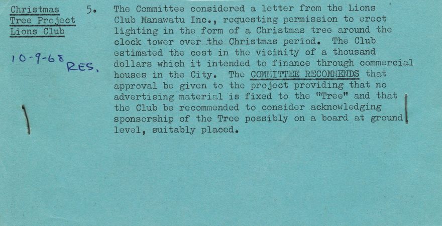 In 1968 the Lions Club of Manawatu sought approval to light the Clock Tower in The Square in the form of a Christmas tree, funded by local commercial organisations. The Reserves Committee of the Palmerston North City Council recommended that this be approved.