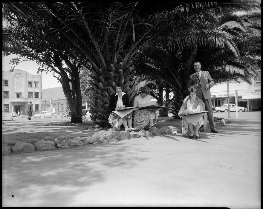 This image was taken for a story that ran in The Manawatu Evening Standard on November 1960 "Teachers' College students were out in full force in the Square yesterday on an art mission. They had plenty of comments made to them by passers-by, but they took them all with a smile."