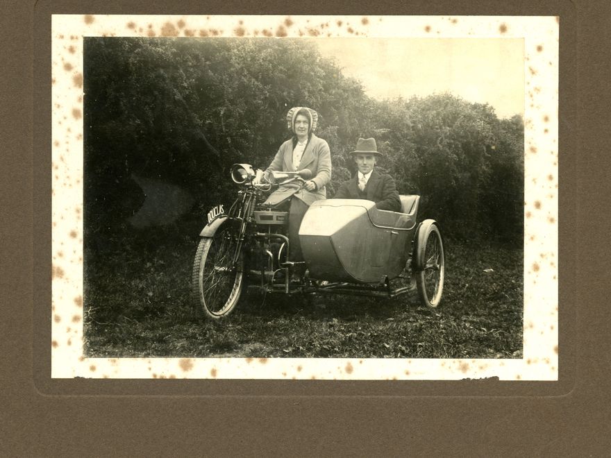 This photograph shows a woman on a 2-Speed Douglas motorcycle and a man riding in the sidecar. The people are unidentified, but also appear in 2015P_IMCA-DigitalMaster_011122.