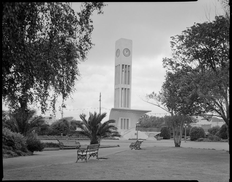 The clock in the Clock Tower, named Kerei Te Panau after a local Rangitane chieftain, was originally housed in the Chief Post Office of Palmerston North. Due to safety concerns both the tower and clock were removed from the Post Office after the 1942 Wairarapa earthquake, and the clock placed in storage. In 1953 Arthur Hopwood gifted the city of Palmerston North £10,000 to build a new tower in The Square to hold the clock and chimes. It was completed in 1957. The Clock Tower has experienced a number of changes including the removal of the original sound shell at the base of the tower in the early 1990s and the addition of a cross (both features are visible in this image). During 2007 the Clock Tower was refurbished and it is now topped with a lantern style cross.