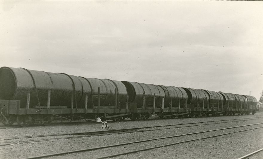 Pipes, being transported by rail for the construction of the Mangahao electric power scheme. After being delayed by the first world war construction began in late 1919 and the station opened in November 1924. The Managahao Scheme provides hydroelectric power and is situated near the town of Shannon. It serves Wellington, Horowhenua, Taranaki, Hawkes Bay, and the Wairarapa.
