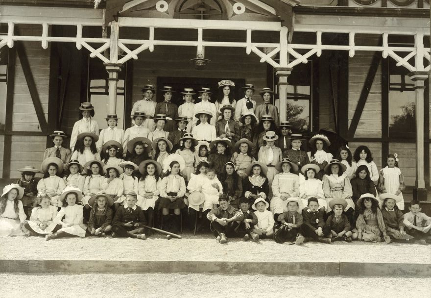 This is likely to be St. Mary's Convent in Wellington, c.1908. Not all pupils are named. The original photograph has hand written notes on the back, transcribed as follows. From left. Back Row: Nita Greene (boarder); Molly Lynch (boarder); Kathie (Kathleen) O’Donnell (boarder); Eileen Johnstone; Mary Mahony; Eva Gasquoine; Nora [Unknown]. 2nd row: Ciss Chatinal; Dolly Brodey; May Carkeek; Katie Franklin; Alice Draper; Girlie Gibbs; Eily Hurley; Muriel Bevan; Barbara Dunk; Elsie Draper. 3rd Row: Gertee Peters; Mary Rogan?; Muriel Blake; D Curtis?; Doris Holdsworth.