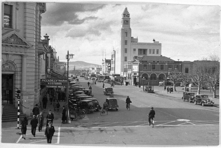 The photograph looks from the corner of Rangitikei Street down along Broadway. The building on the left is the former Bank of New Zealand building which was demolished for a new BNZ. The building with a clock tower is the Australasian Temperance and General Mutual Life Assurance Society Ltd (T&G) building. It was designed by A and K Henderson in the distinctive 'house' style developed by the firm and built 1938. Also visible is the Bank of Australasia, Piccadilly Tearooms and the Bank of New Zealand.