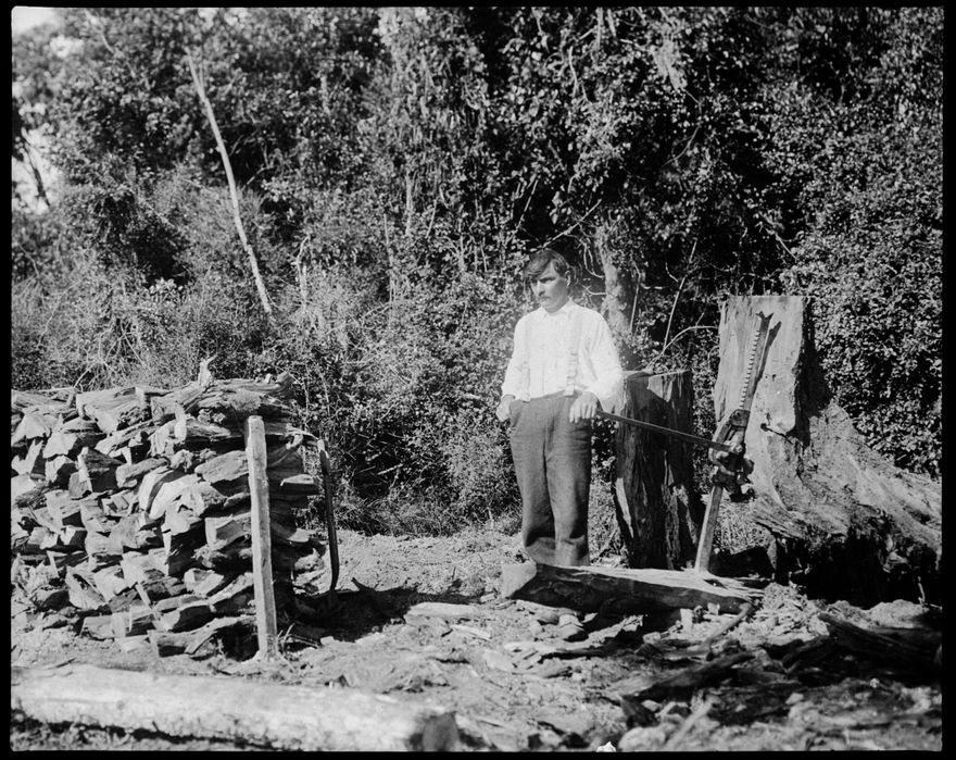 Arthur Koehler was born in Palmerston North to a German father and Danish mother. In 1917, he is listed on his military record as living and working in Gisborne. He is shown here stumping with a jack.