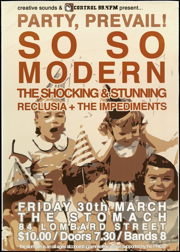 Creative sounds & Control 99.4Fm present... Party Prevail! So So Modren. The Shocking and stunning Reclusia The Impediments. Friday 30th March. The Stomach 84 Lombard Street. $10.00/doors 7.30/ Bands 8. The Stomach is an all ages alcohol/drug/smokefree venue supported by the PNCC. Part of a collection of posters that were displayed at The Stomach, Lombard Street, venue for Creative Sounds Society Incorporated.