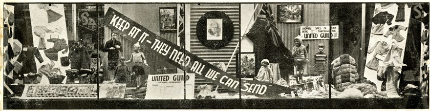 The United Guild mounted a Palmerston North window display to publicise the work they were doing for air-raid victims in England during WWII. The Guild operated under the patronage of the Kairanga County Council, combining and co-ordinating the efforts of 34 organisations of Manawatu towns and country districts. By 1941 it had forwarded 13,000 garments through the Lady Galway Guild in Wellington. Published in the Free Lance 23 July 1941.