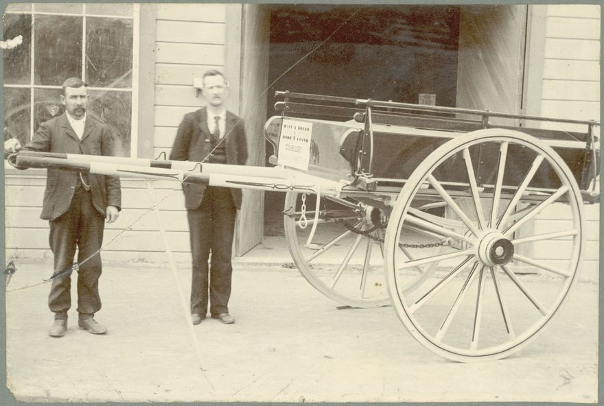 Thomas Hall (left) and another person standing beside a gig. Thomas hall was a coachbuilder in the 1930's.