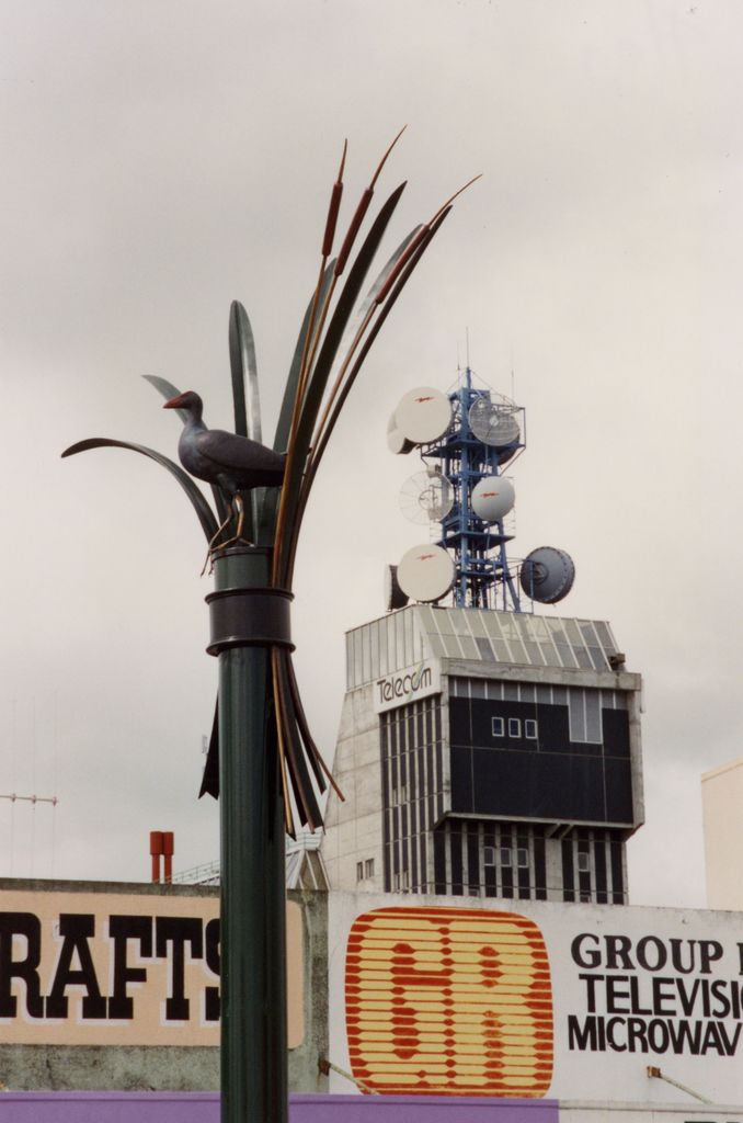 "Pukeko and Raupo" was commissioned by the Palmerston North City Council in 1994, The sculpture is constructed from bronze (the Pukeko) and steel (the raupo) and stands atop columns on Broadway near the corner of Princess Street.