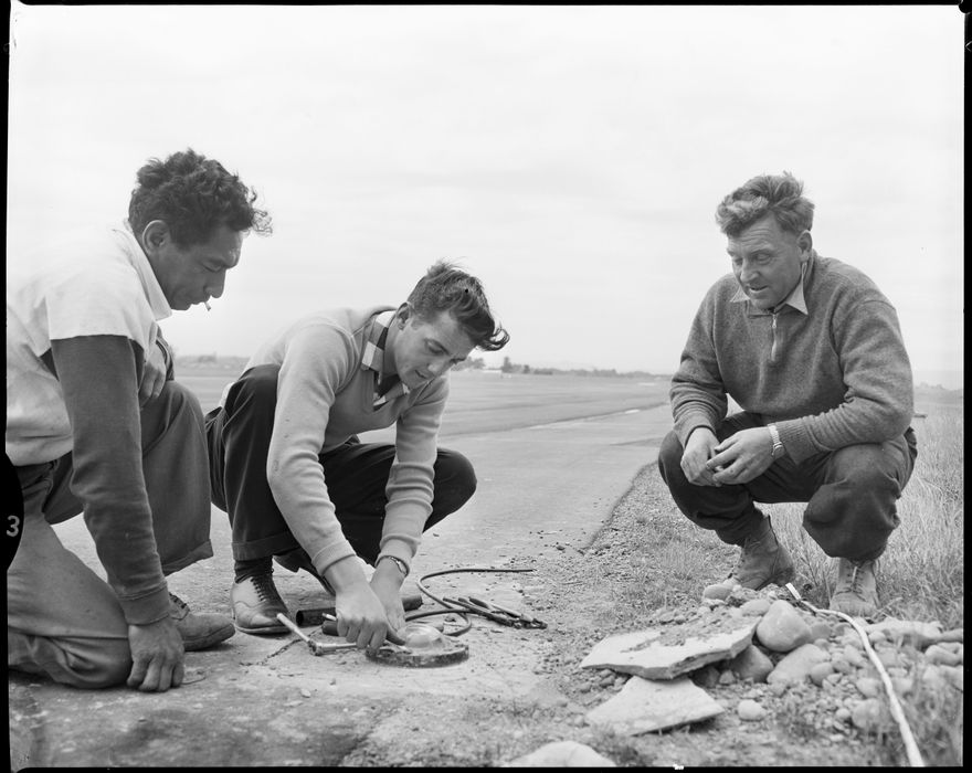 This image was taken for a story that ran in The Manawatu Evening Standard on 24 November, 1959. “The lighting on the second half of the Palmerston North Airport runway will be completed soon and the full runway will be ready for day and night landings. Those in the photograph installing the lights are (from left): Messrs E. Te Rangi (Palmerston North, D. Sutton (Ministry of Works electrician from Auckland) and T. Ludeman (Feilding).”