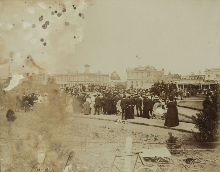 The lakelet was the main feature of the last quadrant of The Square to be developed by the Beautifying Society. James Nash, Mayor of Palmerston North, standing centre on the bridge, is opening the Lakelet before a crowd. The Lakelet is shaped as a butterfly, with the 'wings' bisected by a bridge as its body. It is also referred to as the Butterfly Lake.