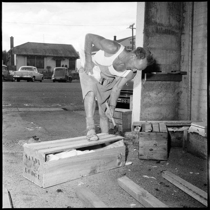 This image was taken for a story that ran in The Manawatu Evening Standard on 04 May 1961 "Mr. R.M. Brill was this morning flummoxed by a fluttering fowl which decided that it had an aversion to being frozen. The bird made a frantic bid for freedom in Princess Street, causing Mr. Brill to assume a rather ungainly angle to effect a capture. Held fast by Mr. Brill. the wayward bird was soon returned to its case."