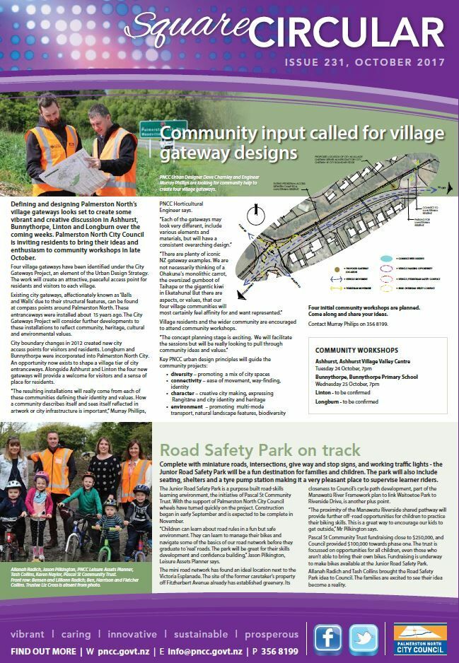 The Square Circular was Palmerston North City Council's monthly community publication, informing Palmerstonians of PNCC initiatives, activites, and events. This month's issue includes: gateway designs; junior road safety park; Grant Smith; recycling; Local History Week; Memorial Park; economic growth; youth space; economic growth; Jaycee travel fund; the Regent; Aokautere reservoir; Turitea pumping station; pest control; councillor contact details; council meetings.