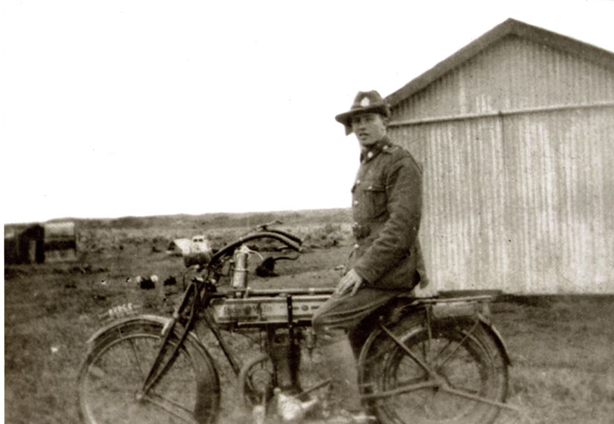This photograph shows Bert Malcolm on a motorcycle - the markings on the bike indicate that it is a Rudge Multi. Shortly after this picture was taken, he left for war service in Egypt and Palestine with the Wellington Mounted Rifles. After the war, Bert was a building contractor in Palmerston North between 1925-1960.