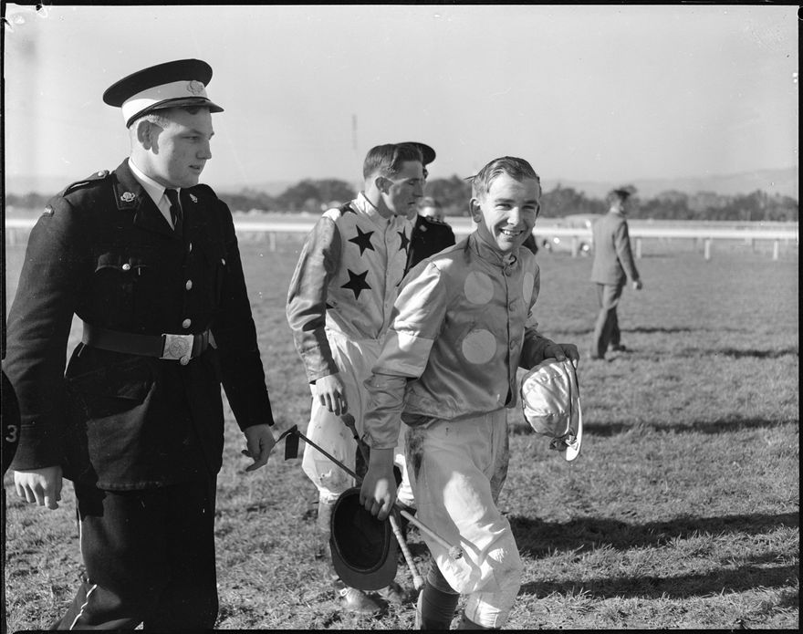 This image was taken for a story that ran in The Manawatu Evening Standard on 18 July, 1959. "M. I. Griffin (foreground) and C. I. Goss the riders of Skipper and Barrice respectively, are seen walking to the birdcage with a St. John Ambulance assistant after they were dismounted at a hurdle in the first race at the Manawatu Hunt Club's annual steeplechase meeting today."
