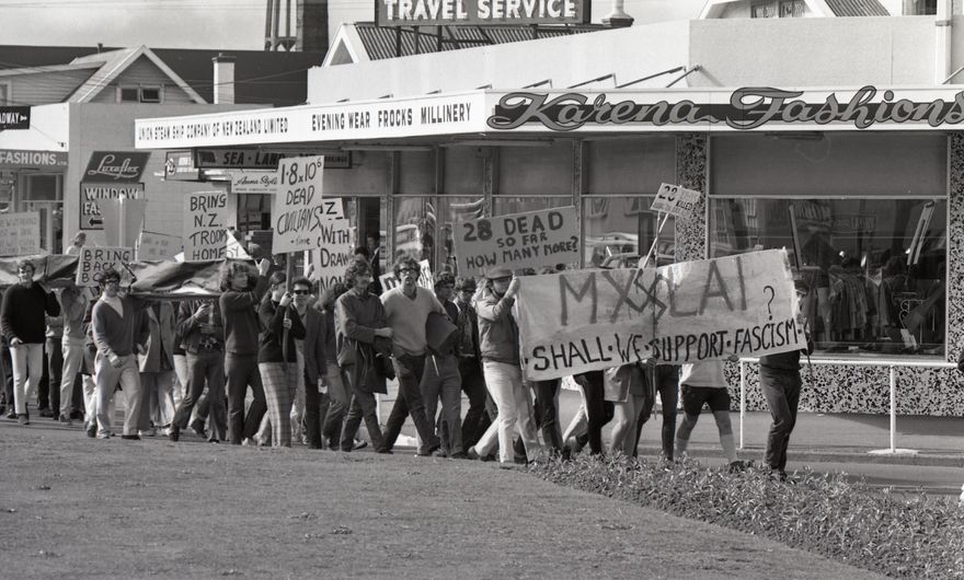 "More than 200 anti-Vietnam war demonstrators marched quietly and solemnly along Broadway Avenue in Palmerston North shortly after noon yesterday, carrying a dozen black-draped coffins designed to symbolise the 28 New Zealanders killed in the Vietnam War.
