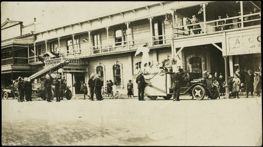 On Saturday 19th of July these fire engines were preparing to join "D" section as part of the peace procession held to celebrate the end of World War One. These celebrations were held on July 19-21 1919 in Palmerston North. On Saturday the 19th of July at 9.30 am a 21 Gun Salute under the director of Col. McDonald was executed. Later speeches were given at the Show Grounds. On Monday - Children's Day - 21st of July as a procession was undertaken through Palmerston North to the Show Grounds, 500 pigeons symbolising peace were released from the oval.