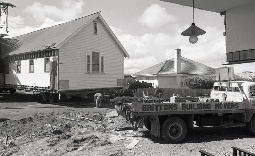 This photograph ran in the Manawatu Evening Standard on 19 February 1973 with the caption, "It looked like a case of "if Mohammed wouldn't go to the mountain, the mountain ad to go to Mohammed" when St John's Presbyterian Church, Palmerston North, was moved on Saturday. The Church wants to get closer to its parishioners, most of whom are now in the Highbury area, so it was moved by a Whanganui firm from Nikau Street to Brentwood Avenue. City Council staff lifted power and telephone lines along Featherston Street as the 26ft high building moved along. It took about three hours for the church to reach the new site where it will be renovated and extended."