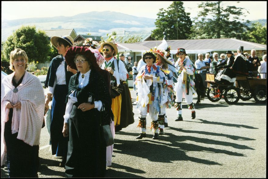 On the occasion of the Ashhurst (former) Post Office building's centenary. The building is now used at the town library. In this photograph a parade of people walk down the street.