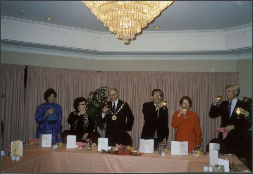 Drinking a toast at the official welcome dinner for the Chinese Ambassador. Ni Zhengjian was the Chinese Ambassador to New Zealand at the time. From left: Unknown; wife of Ambassador; Mayor, Paul Rieger; Chinese Ambassador; Unknown; Unknown.