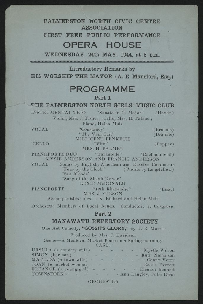 A programme from a concert produced by the Palmerston North Civic Centre Association featuring performances by the Palmerston North Girls' Music Club, the Manawatū Repertory Society, and the Little Theatre Society.