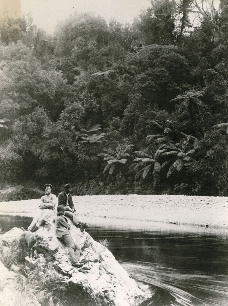 Members of survey party and dog on the Otaki River. The Otaki River originates in the Tararua Range and flows for 45 km, firstly heading southwest through a valley in the Tararua Ranges. It turns northwest in the area of Otaki Forks, where it is joined by the Waiotauru River. After continuing through Otaki Gorge it reaches the Tasman Sea south of the settlement of Otaki Beach.