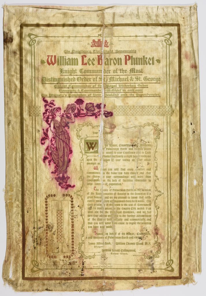 This illuminated address was given to William Lee Baron Plunket on his taking up residency in Palmerston North in 1908.