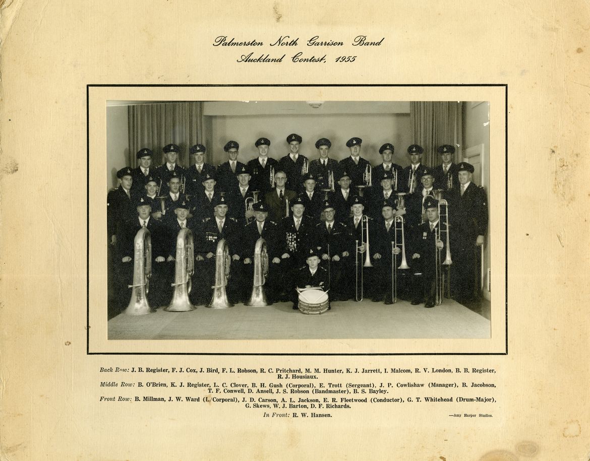 The Palmerston North Garrison Band was established in 1864, one of the city's oldest groups.. In 1972 it became the Palmerston North Brass Band. This photograph was taken when the band competed in Auckland, 1955.