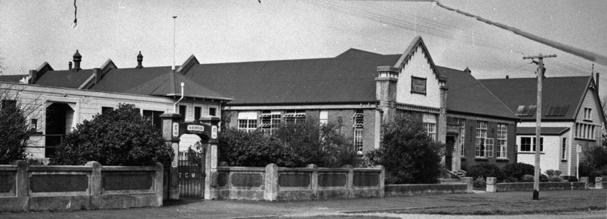 Terrace End School facing the Ruahine Street entrance, with Memorial gates and baths on the left. A previous original Terrace End School building was situated in Main Street in 1884. Mrs Harvey was the first teacher. In June 1884, the School was moved to Deard's Hall in Main Street, near its current location. Mr G.Nye was headmaster. He was followed by D.H. Guthrie, C.H. von Blaremberg and T. F. Fairbrother (by 1893). The School was moved to Terrace Street (renamed Ruahine Street in 1926) in September 1885. Several new buildings were constructed between 1927 and 1960.