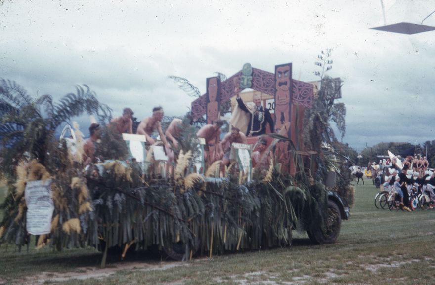 This image depicts a mock haka party on a float created by the Manawatū Savage Club. Mockery of kapa haka was once considered 'just a bit of fun' and was often conducted during public events. The practice slowly died out across Aotearoa in the face of protest and education about manifestations of institutional racism, particularly after the 1979 'Haka Party Incident' at Auckland University. The Manawatū Savage Club was established in 1908, and changed its name to OnStage Manawatū in 2020.