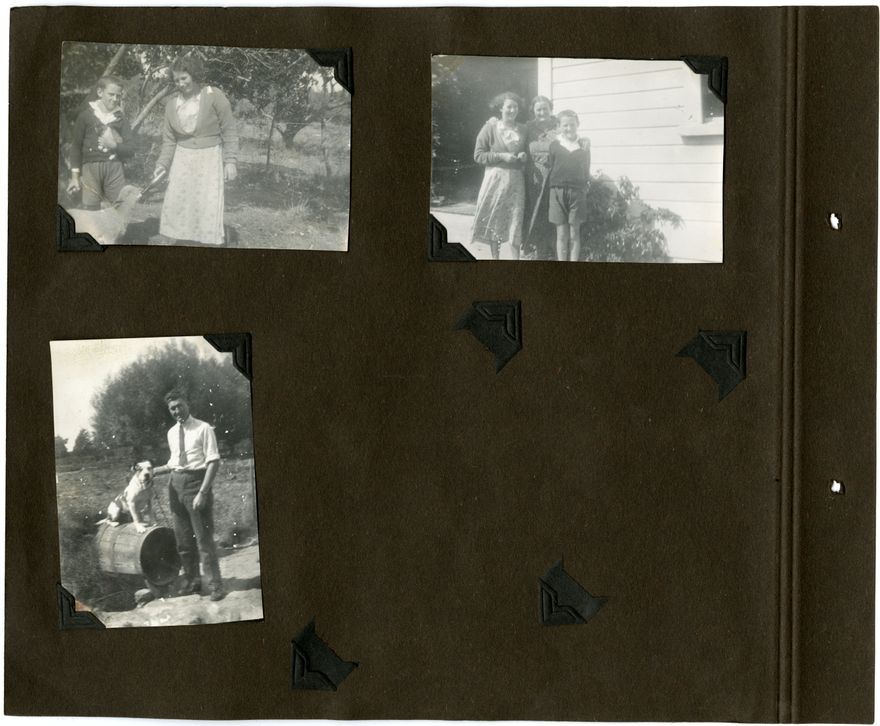 This 1930s photograph album belongs to the Barrow Family, of Palmerston North. Subjects include family members, pets, airplanes, the 1935 flood, cars and car crashes, the Esplanade Gardens and other local landmarks.
